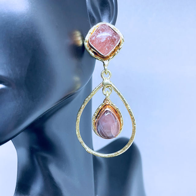 18K Gold Plated and Copper Drop Earrings with Strawberry Quartz Stones