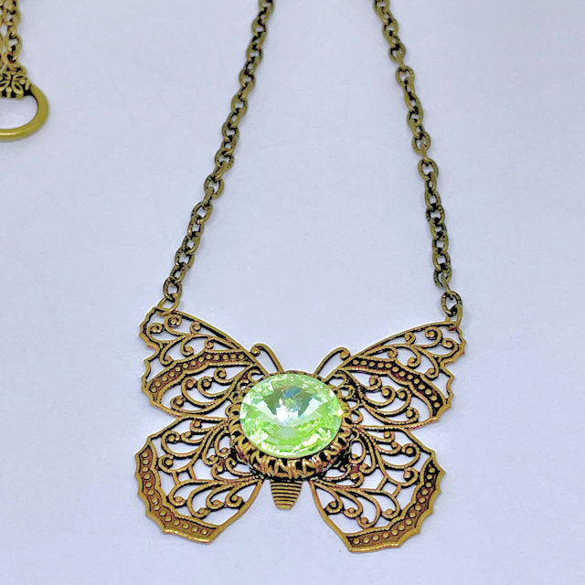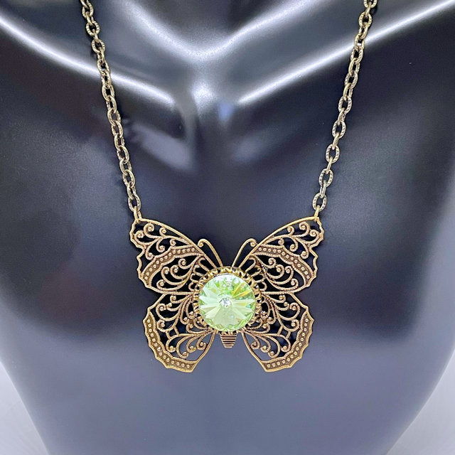 Add a splash of whimsy to your look with this 20" Antique Bronze Filigree Butterfly Necklace, sparkling with a lively faceted lime green stone on a charming bronze chain.