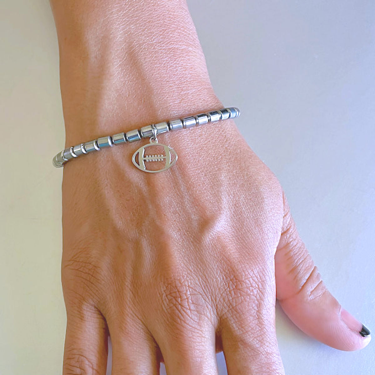Barrel Shape Silver Hematite Football Charm Stretch Bracelet