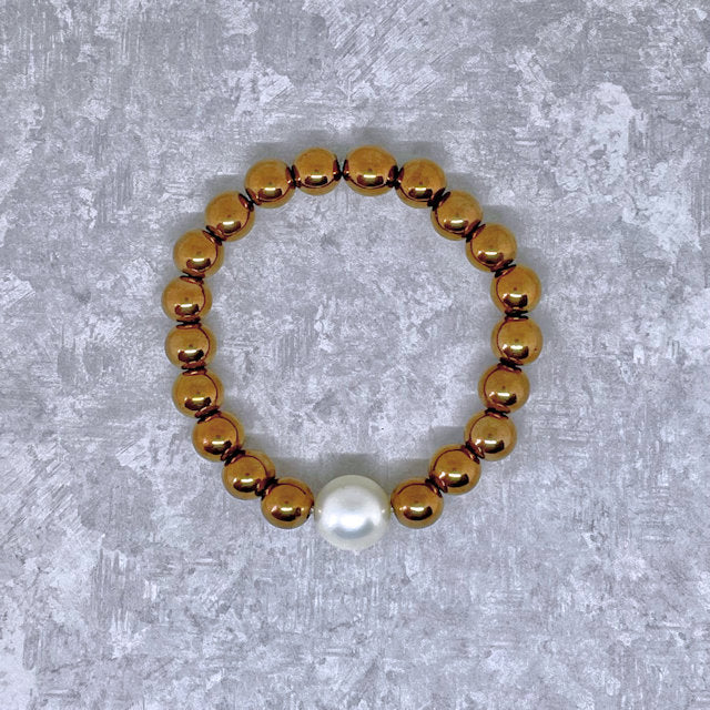 Add a little sparkle to your wrist with this 10mm bronze hematite stretch bracelet, playfully accented with a shiny 14mm faux pearl bead.
