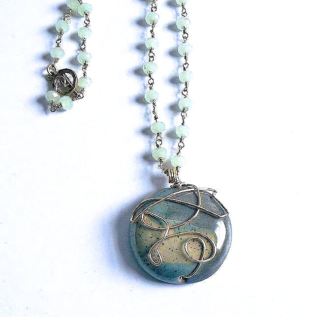 Ceramic Clay Pendant with Seafoam Wire Wrapped Beaded Chain