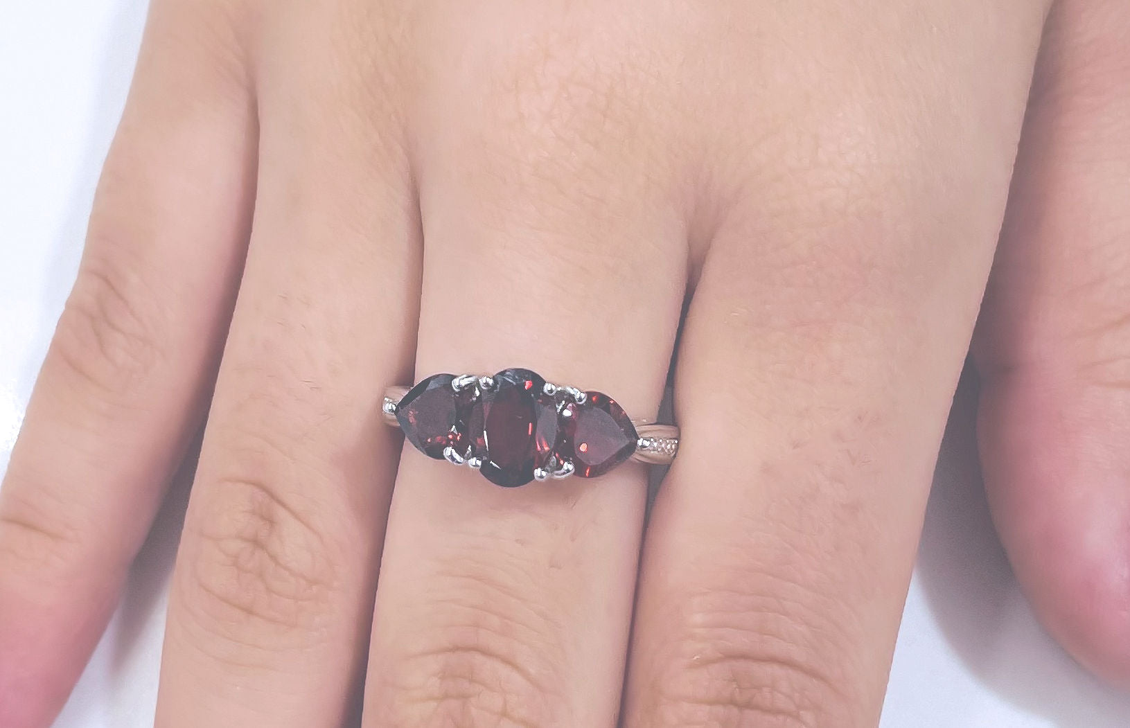 This stunning ring features a captivating oval garnet gemstone, complemented by a delicate heart-sharped accent.
