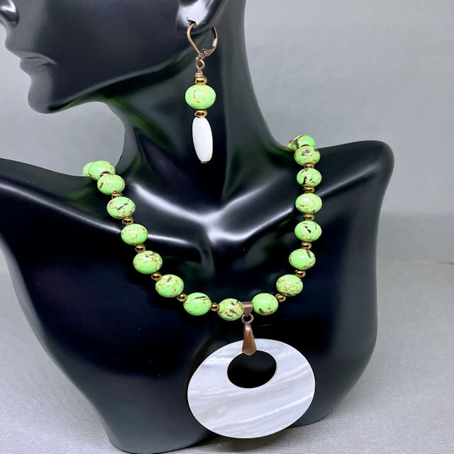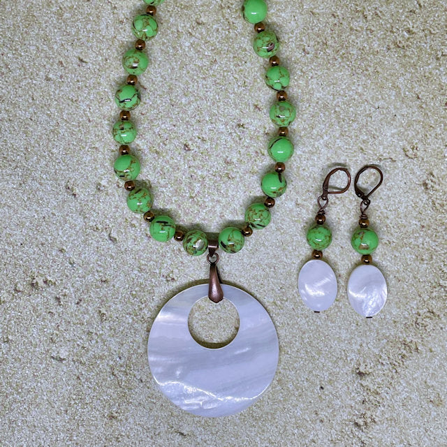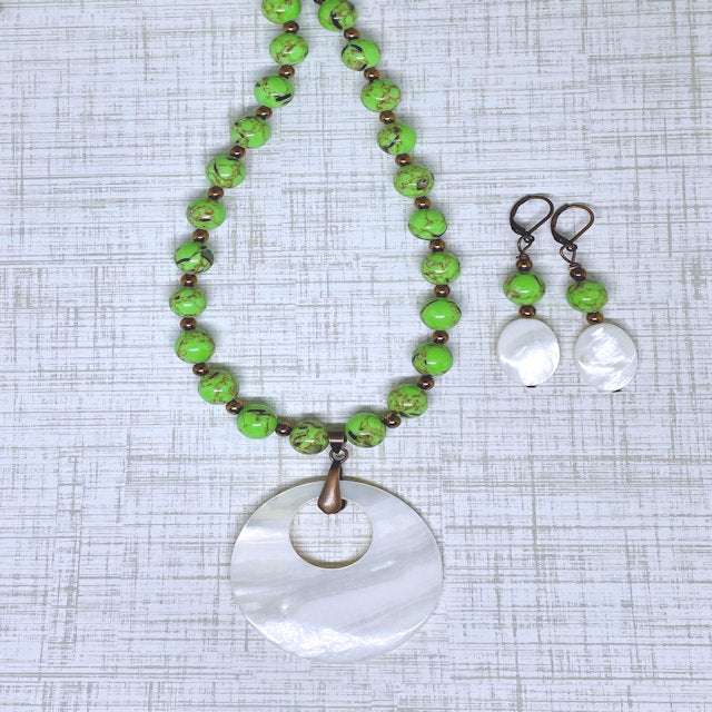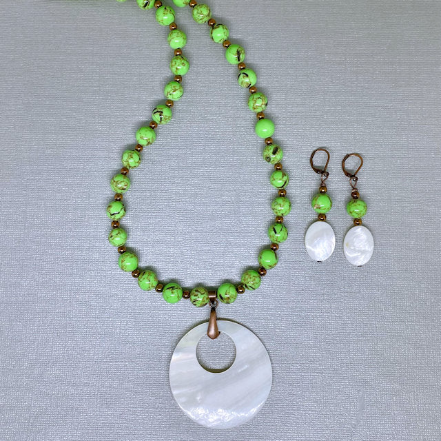 20 1/2" Green Magnesite necklace with Mother of Pearl pendant and matching 2" earrings. Features 10mm green Magnesite beads, 4mm Copper Hematite spacers, and a copper toggle clasp.