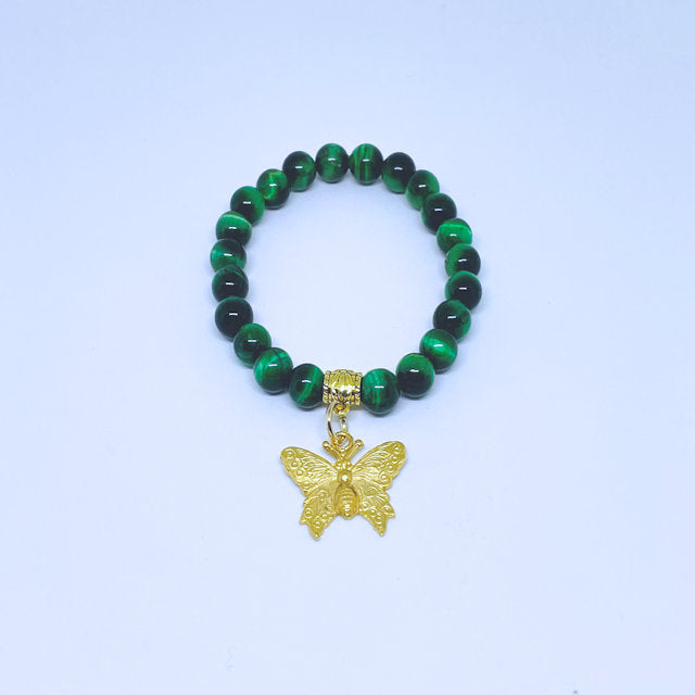 Green Tiger Eye Stretch Bracelet with Gold Plated Butterfly Charm