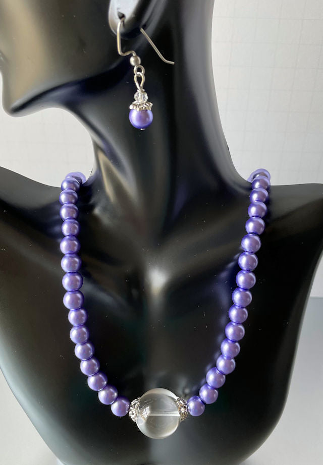 18" Faux Lavender Pearl Necklace and Earring set, adorned with a captivating Round Quartz Clear Crystal Focal Bead.