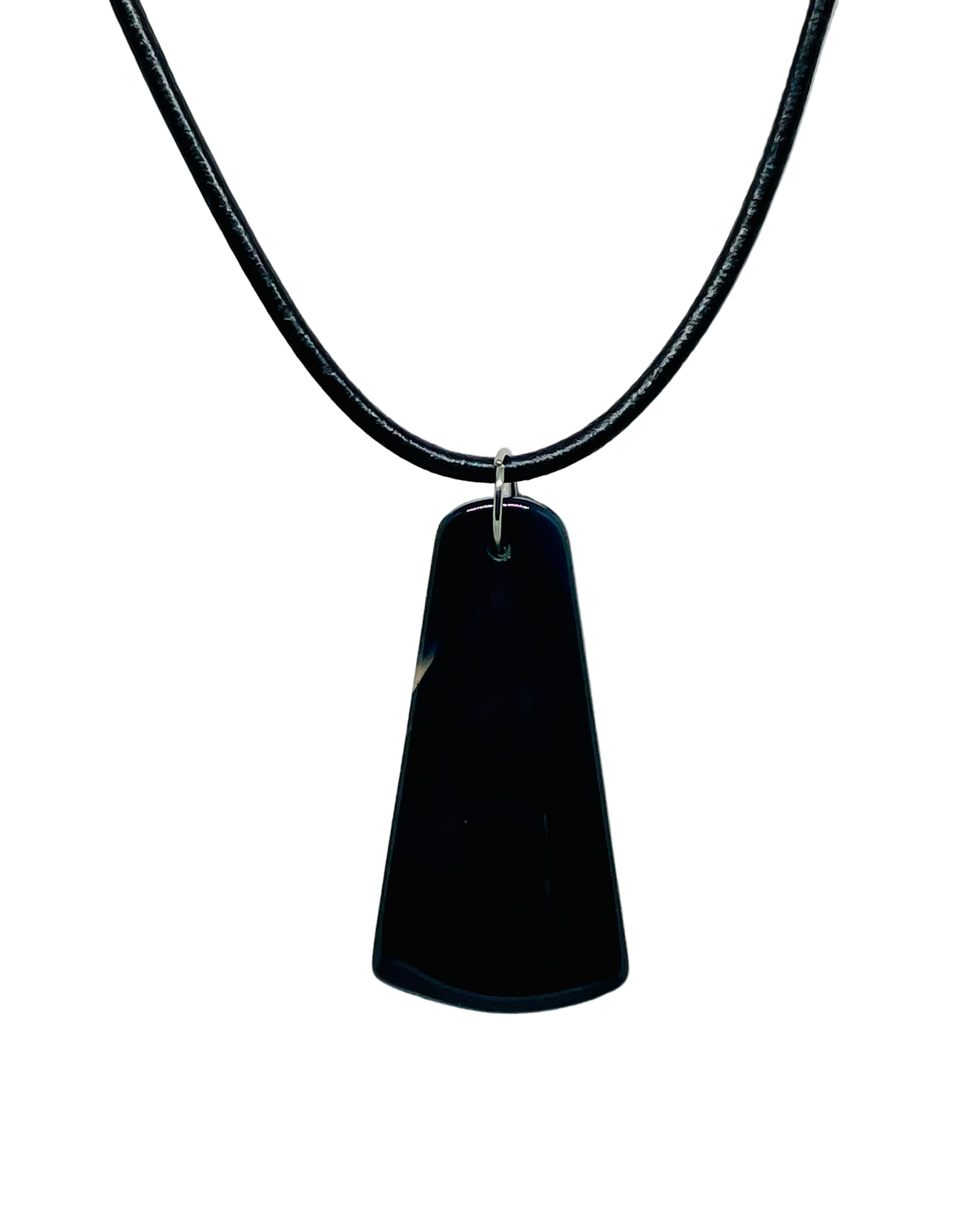 This polished elongated black obsidian pendant, featuring a subtle speck of faded white on the side, comes with a comfortable 20" black leather necklace and a 1 1/2" extender to help you find the perfect fit.