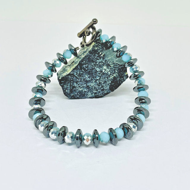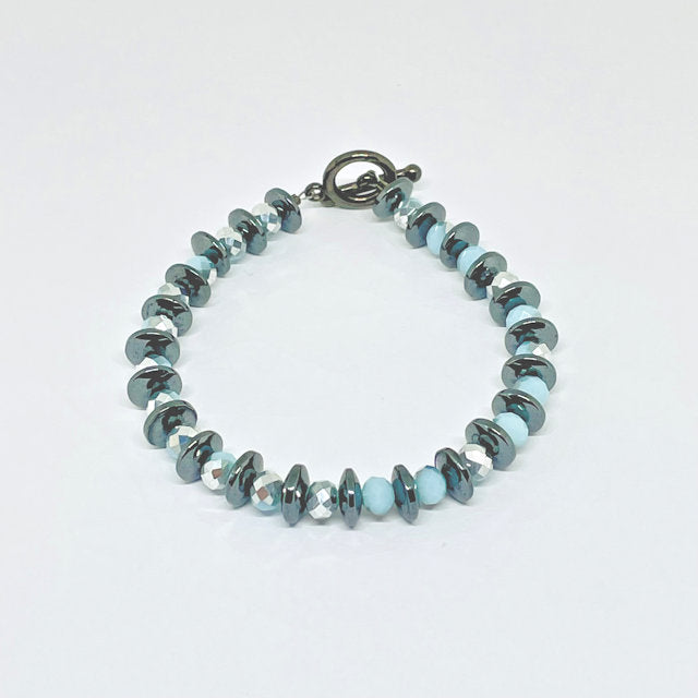 Rondelle Dark Gray Hematite Bracelet with Light Blue/Silver Crystal Beads