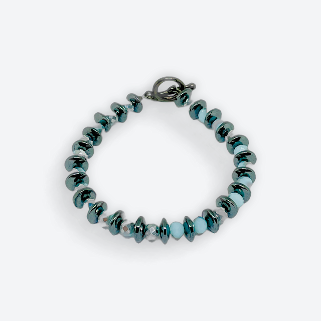 Elevate your style effortlessly with this striking Rondelle bracelet featuring dark gray hematite paired with dazzling bi-color metallic blue and silver crystal beads. 8" Length, with Gun Metal Toggle Clasp.