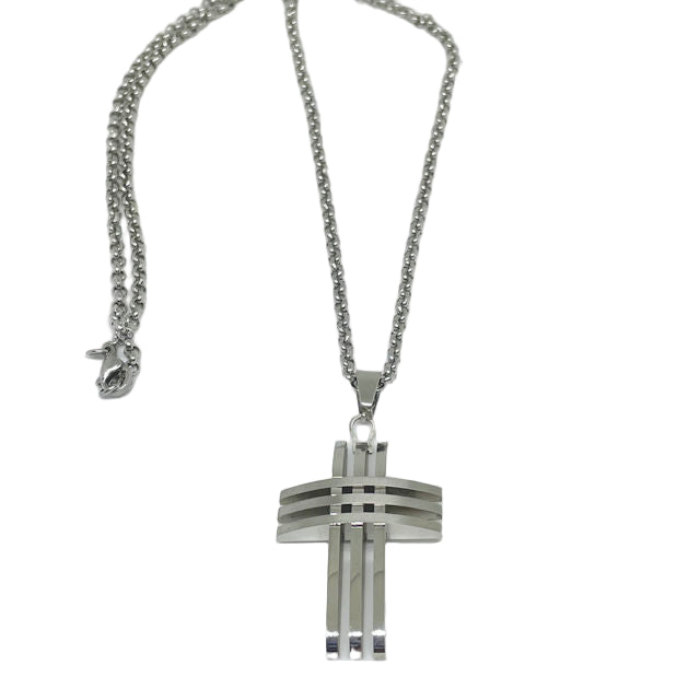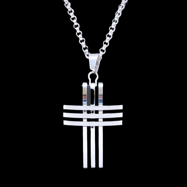 This Stainless Steel Triple Cross pendant, measuring 2 inches in length, is paired with a durable 20-inch stainless steel rolo chain. Perfect for everyday wear, this necklace combines style and resilience to support your personal expression.