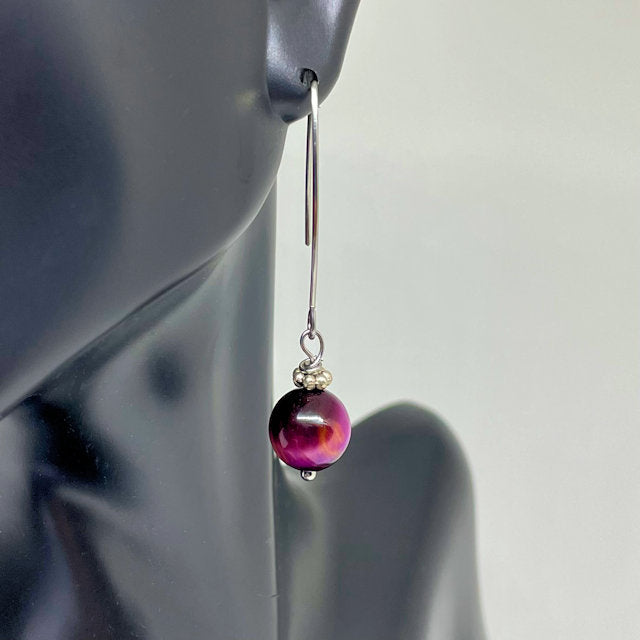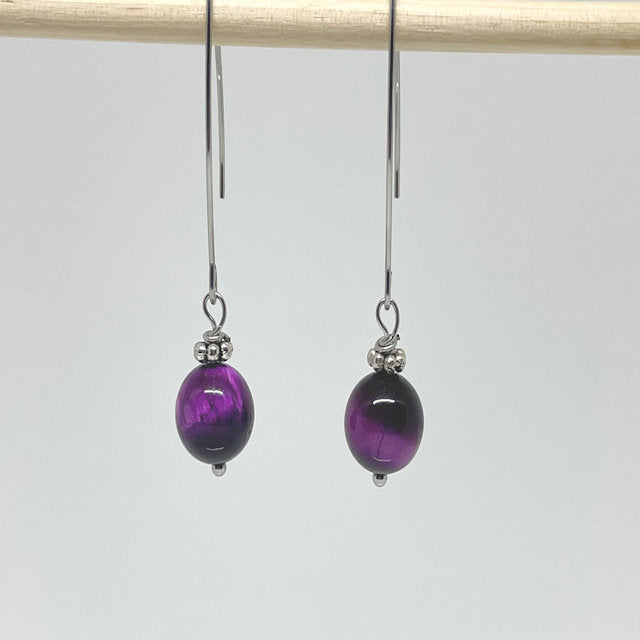 Stainless Steel V Shape Ear Wire accented with Purple Tiger Eye bead