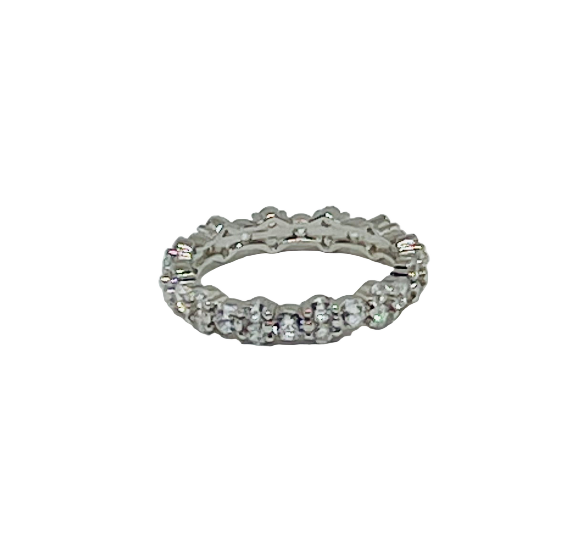 This sterling silver eternity cluster ring exemplifies refined elegance, with precisely arranged gemstone clusters that create a luminous band of enduring beauty and understated luxury.