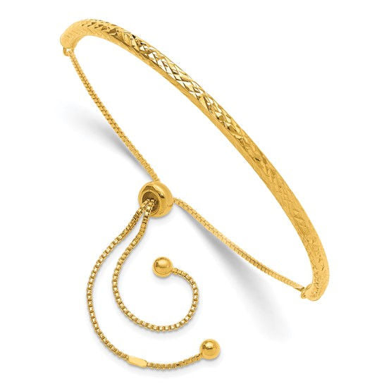 Adjustable bracelet crafted from sterling silver, accentuated by a radiant gold-tone finish and intricate diamond-cut details. This versatile accessory is perfect for both casual and formal wear.