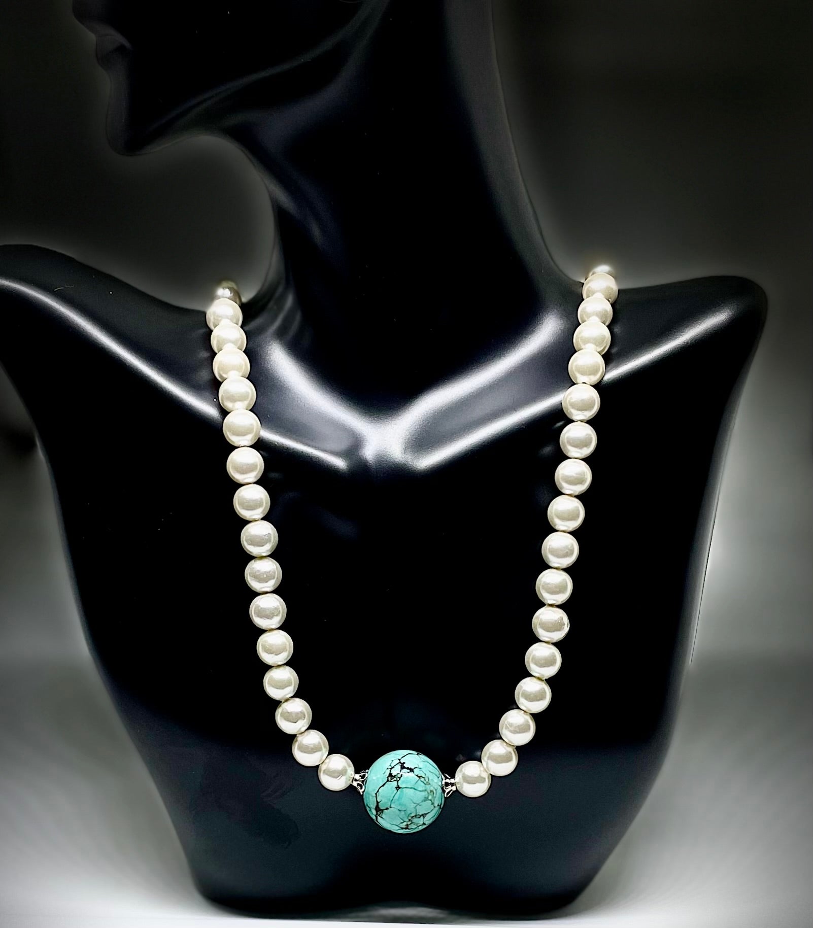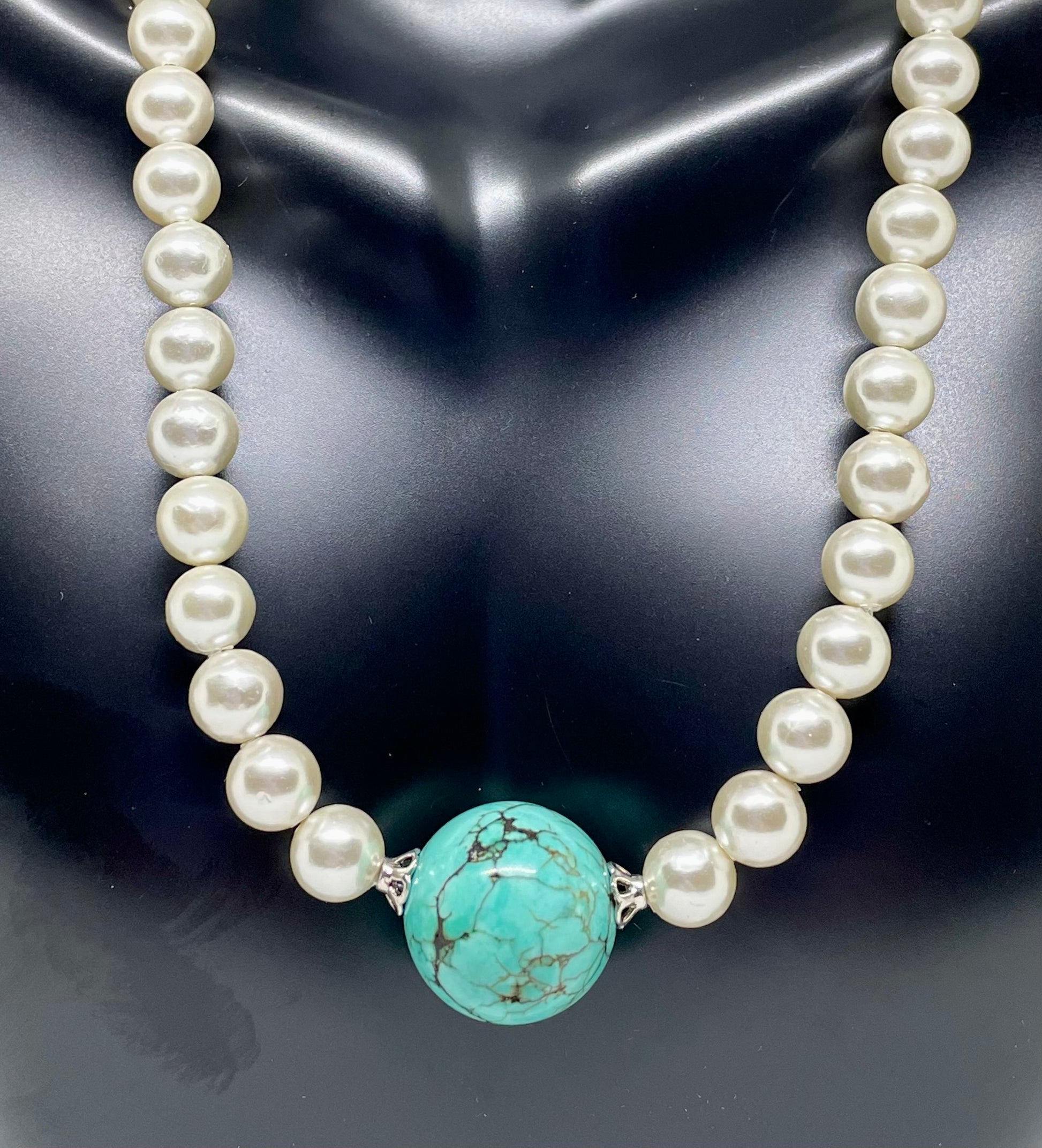 White Pearl Necklace with round Stabilized Turquoise Focal Bead