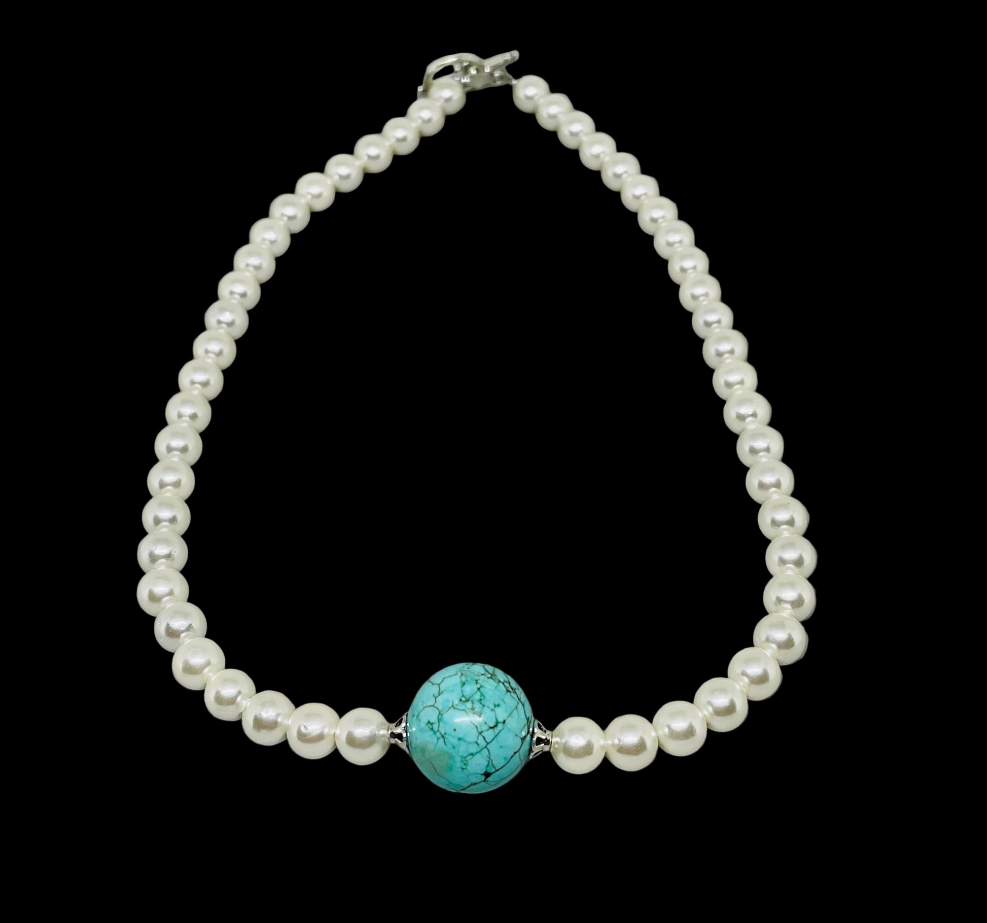 An exquisite 18" white pearl necklace featuring a refined round stabilized turquoise focal bead, blending classic elegance with a subtle pop of color for a truly sophisticated look.